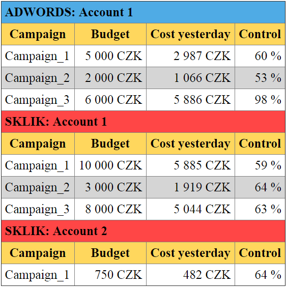 Cílem skriptu je automatická denní kontrola, zda výkonnostní kampaně nenarážejí na limit rozpočtu, v případě překročení stanovené meze pošle skript notifikační e-mail.